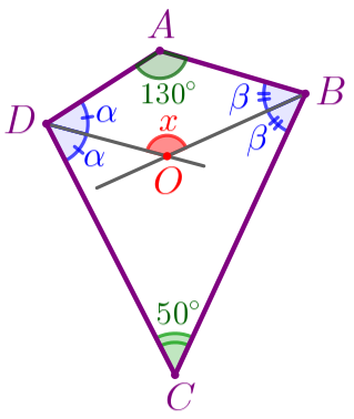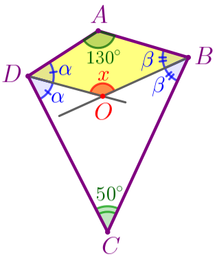 В выпуклом четырёхугольнике \(\displaystyle ABCD{\small:}\) \(\displaystyle \angle A+\angle B+\angle C+\angle D=360^{\circ}{\small.} \) То есть \(\displaystyle \color{green}{130^{\circ}}+2\color{blue}{\beta}+\color{green}{50^{\circ}}+2\color{blue}{\alpha}=360^{\circ}{\small.} \) Получаем: \(\displaystyle 2(\color{blue}{\alpha}+\color{blue}{\beta})=360^{\circ}-\color{green}{130^{\circ}}-\color{green}{50^{\circ}}{\small;} \) \(\displaystyle 2(\color{blue}{\alpha}+\color{blue}{\beta})=180^{\circ}{\small;} \) \(\displaystyle \color{blue}{\alpha}+\color{blue}{\beta}=90^{\circ}{\small.} \) | ![]() |