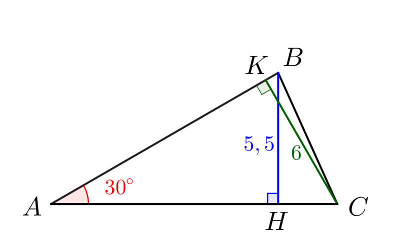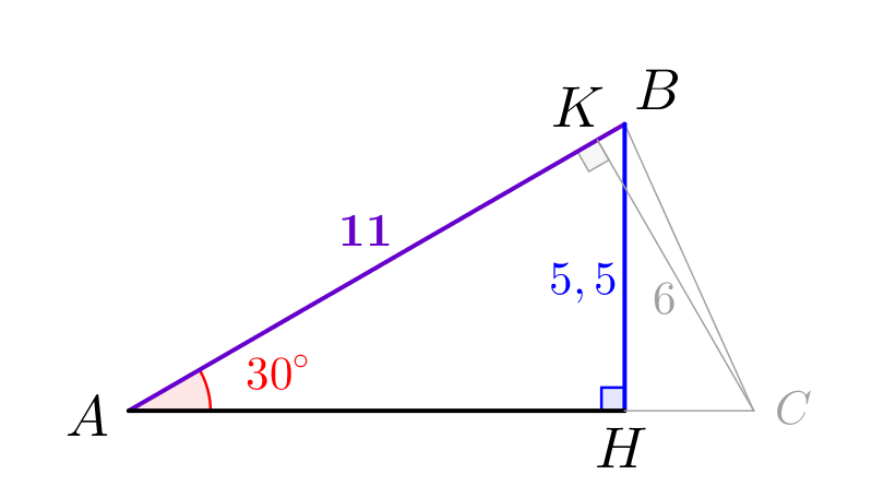 \(\displaystyle AB=\frac{BH}{\sin 30^{\circ}}=11\small.\)