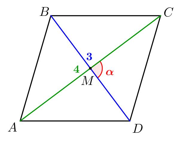 | Обозначим угол между диагоналями параллелограмма \(\displaystyle \alpha\small.\) | ![]() |