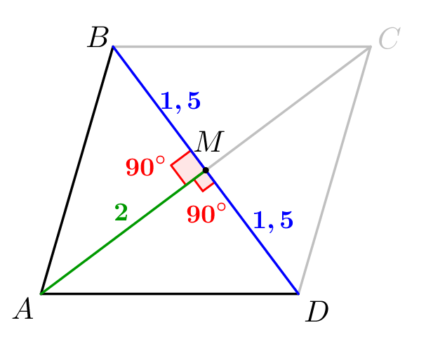 Тогда по теореме Пифагора для прямоугольных треугольников \(\displaystyle AMB\) и \(\displaystyle AMD\) находим гипотенузы: