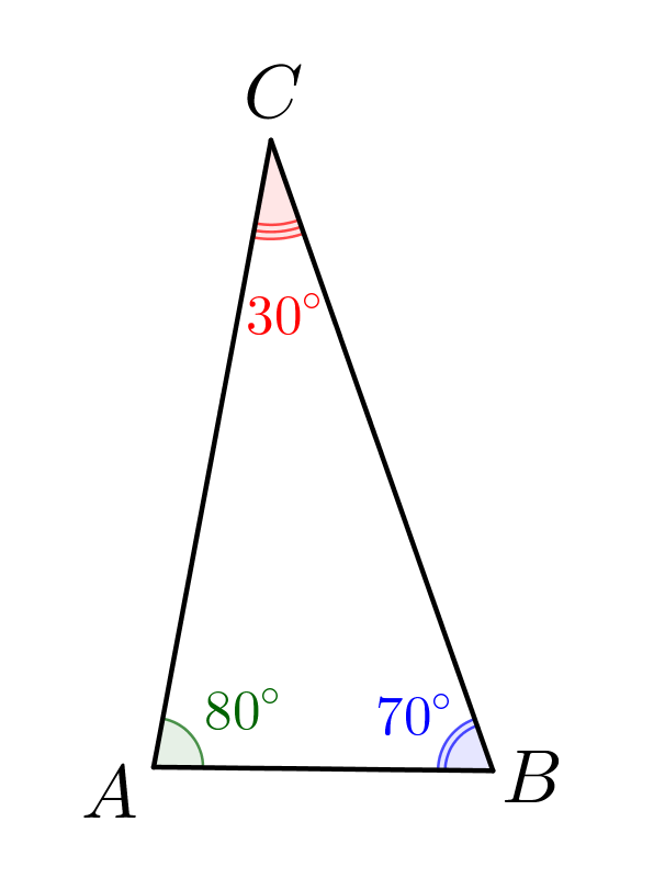 Сразу отметим, что поскольку сумма углов в треугольнике \(\displaystyle 180^{\circ}\small,\) то третий неизвестный угол равен: \(\displaystyle \angle C=180^{\circ}-80^{\circ}-70^{\circ}=30^{\circ}\small.\) | ![]() |
