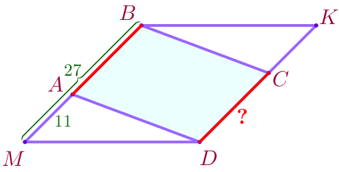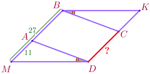\(\displaystyle \color{red}{2.}\) Найдите длину отрезка \(\displaystyle CD{\small,}\) если \(\displaystyle MB=27{\small,}\) \(\displaystyle AM=11{\small.}\)