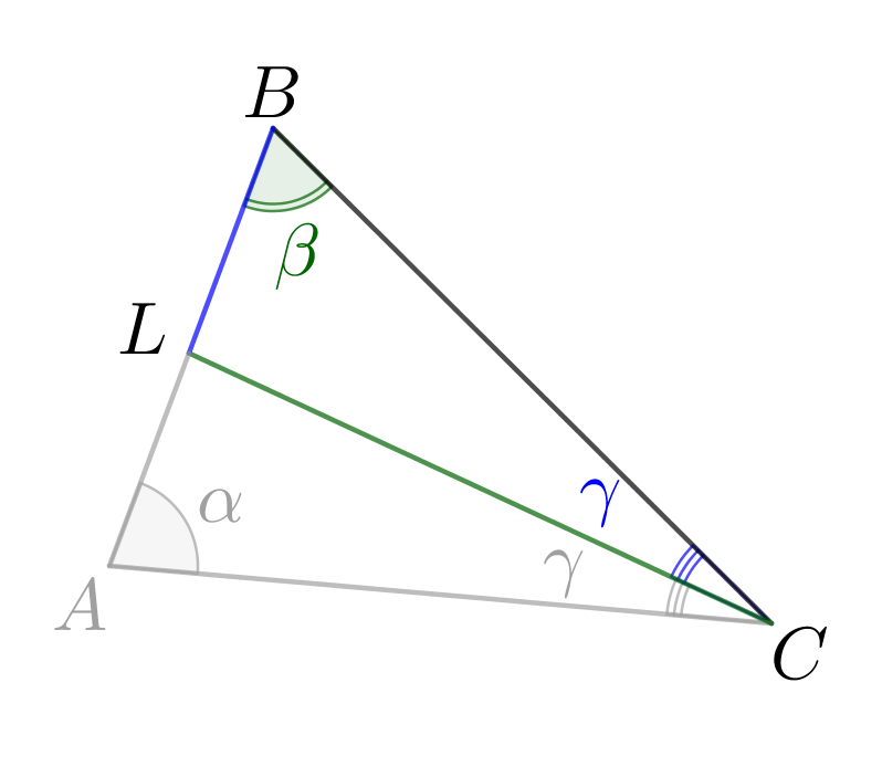 - также сторонами этих треугольников \(\displaystyle ALC\) и \(\displaystyle BLC\) являются отрезки \(\displaystyle AL\) и \(\displaystyle BL\small,\) которые в сумме дают \(\displaystyle a\small.\)