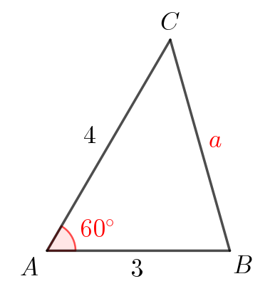 \(\displaystyle a^2=4^2+3^2-2\cdot4\cdot3\cdot\frac{1}{2}=13\small,\)