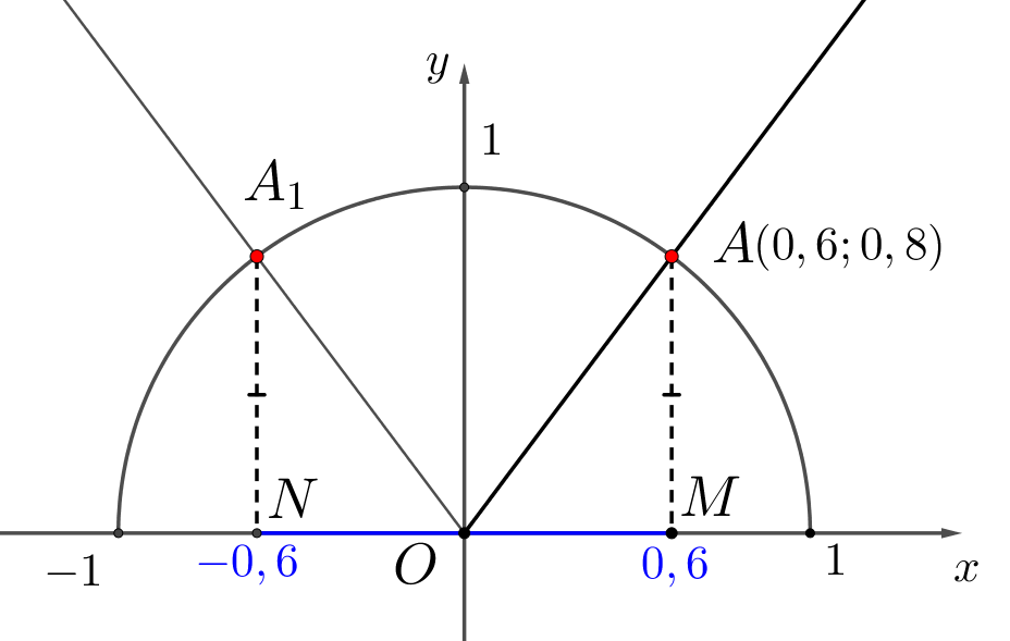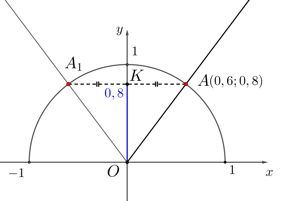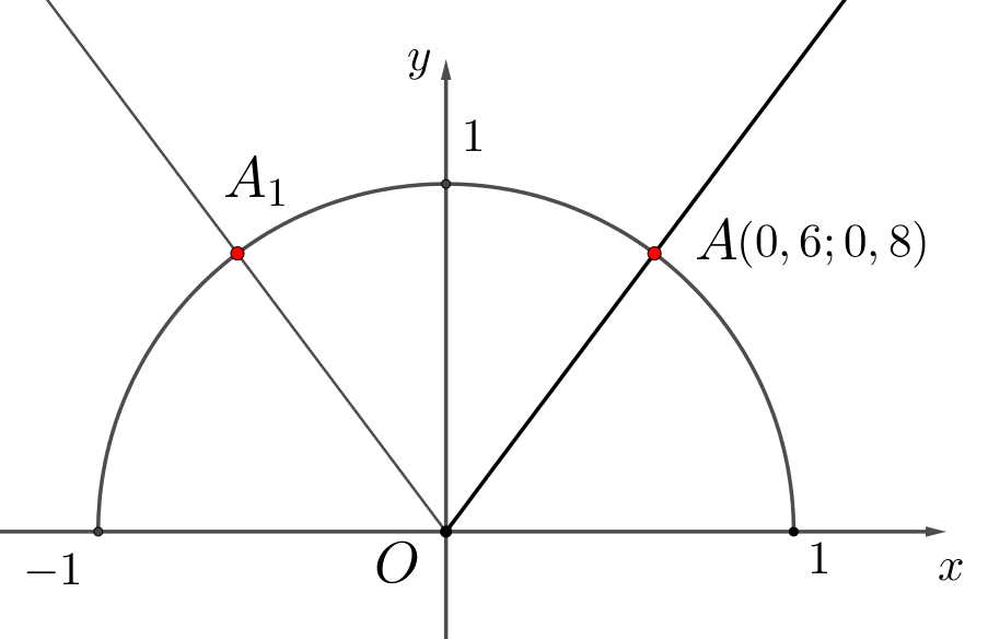 На единичной окружности отмечена точка \(\displaystyle A\small,\) ее координаты равны \(\displaystyle (0{,}6;\,0{,}8)\small.\) Точку \(\displaystyle A\) отразили относительно оси \(\displaystyle Oy\) и получили точку \(\displaystyle A_1{\small:}\)
