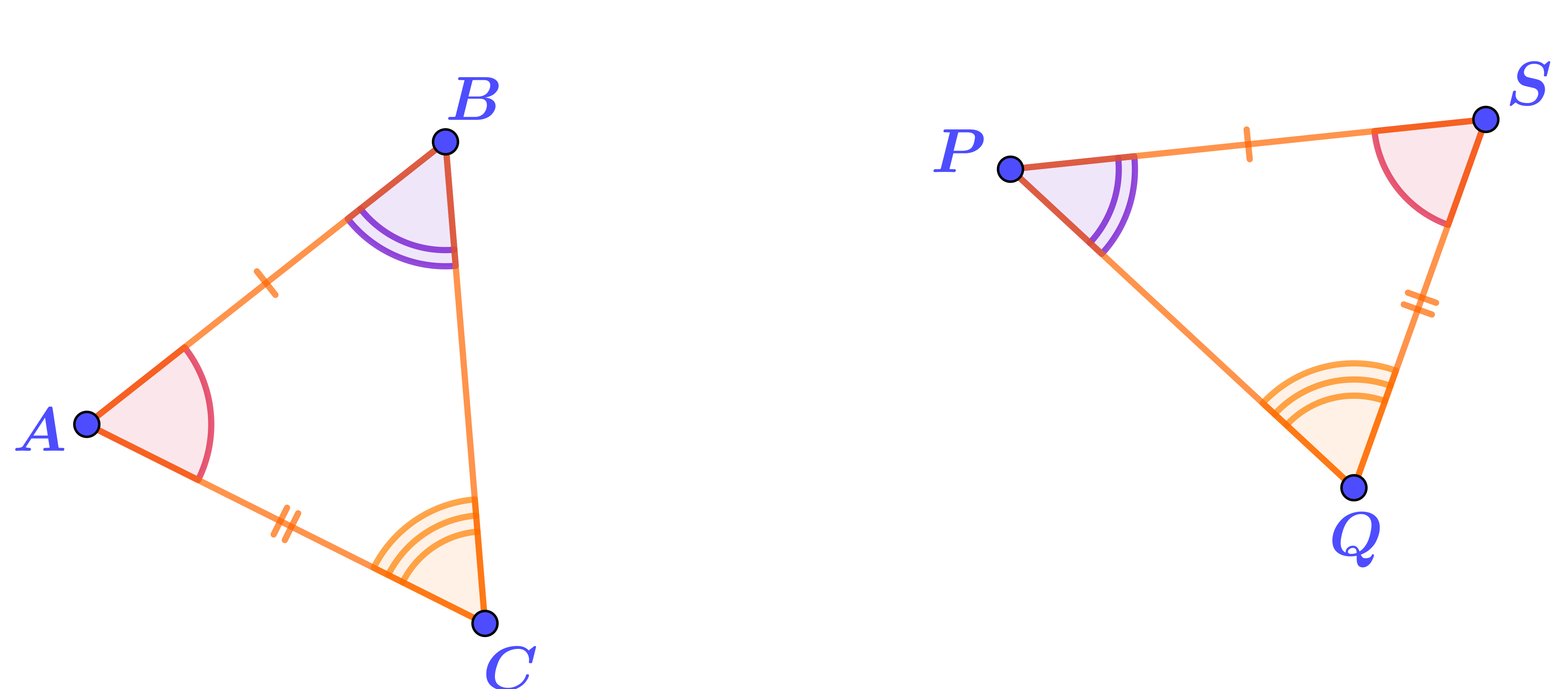 Ответ:\(\displaystyle BC=PQ{\small ,}\) \(\displaystyle {\bf\angle}ABC={\bf\angle}SPQ{\small ,}\)\(\displaystyle {\bf\angle}ACB={\bf\angle}PQS{\small .}\)