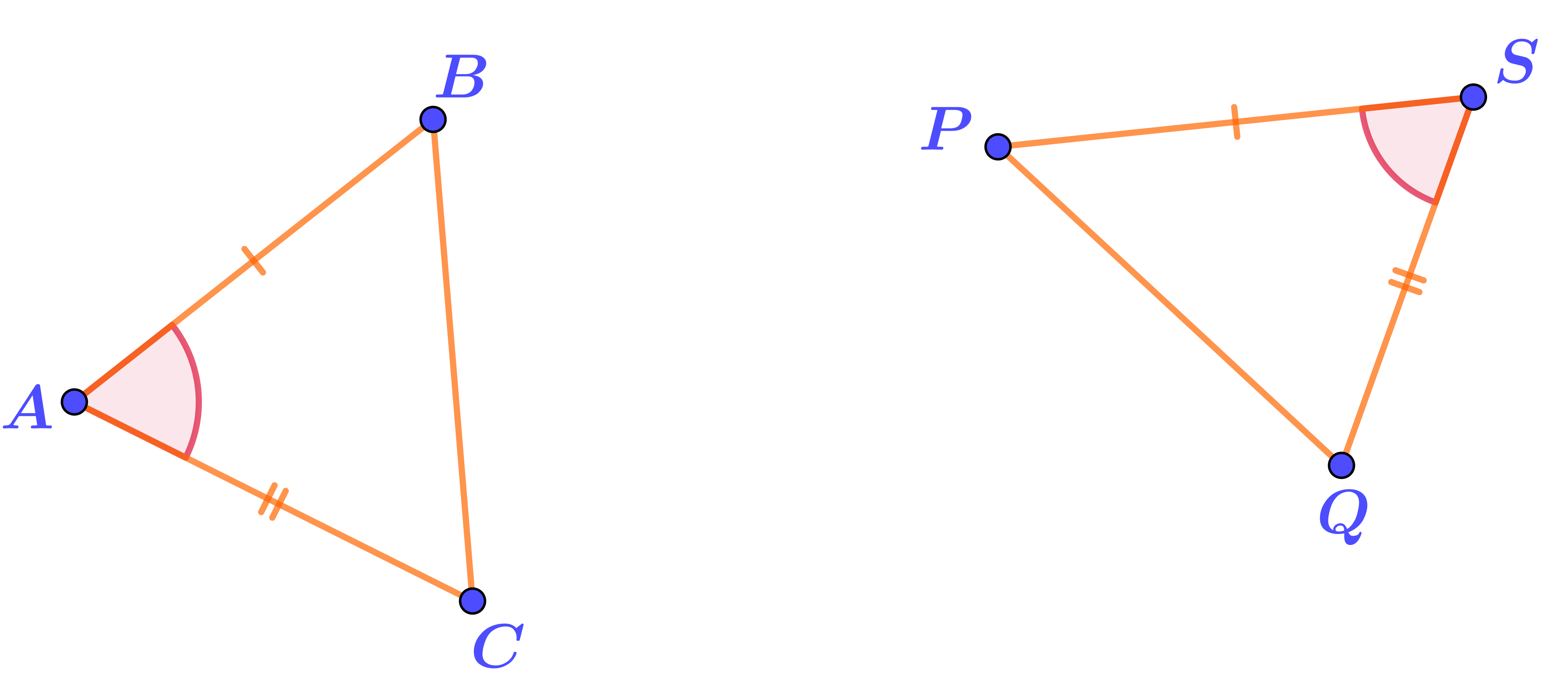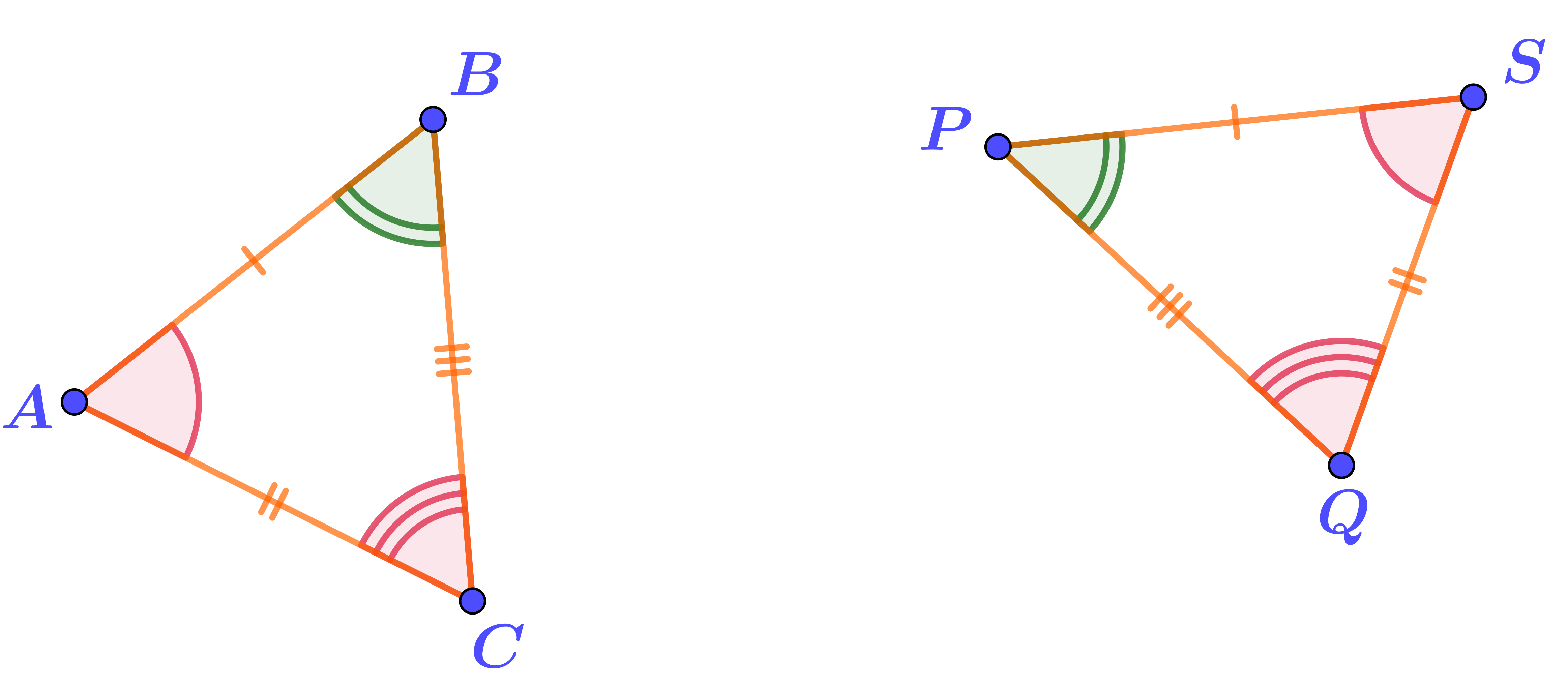 На рисунке в треугольниках \(\displaystyle ABC\) и \(\displaystyle PQS\) отмечены равные элементы.