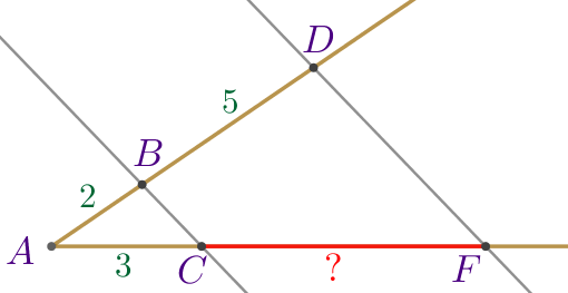 Параллельные прямые \(\displaystyle BC\) и \(\displaystyle DF\) пересекают стороны угла \(\displaystyle A{\small,}\) как показано на рисунке. Найдите длину отрезка \(\displaystyle CF{\small,}\) если \(\displaystyle AB=2{\small,}\) \(\displaystyle BD=5\) и \(\displaystyle AC=3{\small.}\)