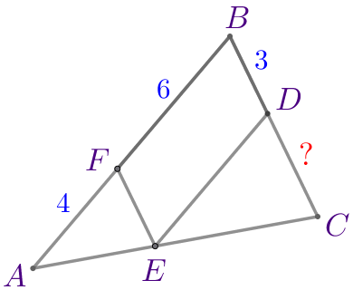 В треугольник \(\displaystyle ABC\) вписали параллелограмм \(\displaystyle BDEF\) так, как показано на рисунке. Найдите длину отрезка \(\displaystyle CD{\small,}\) если \(\displaystyle AF=4{\small,}\) \(\displaystyle BF=6\) и \(\displaystyle BD=3{\small.}\)
