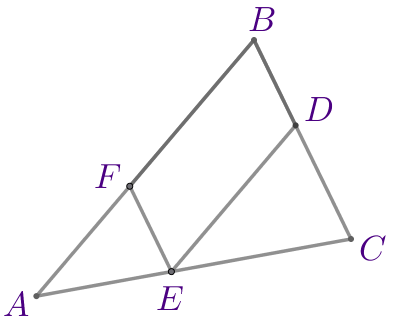 ![]() | Согласно теореме о пропорциональных отрезках: \(\displaystyle \frac{AE}{AF}=\frac{CE}{BF}{\small.}\) Пусть это отношение равно некоторому коэффициенту \(\displaystyle t{\small.}\) То есть \(\displaystyle \frac{AE}{4}=\frac{CE}{6}=t{\small.}\)
