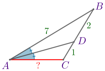 В треугольнике \(\displaystyle ABC\) проведена биссектриса \(\displaystyle AD{\small.}\) Найдите \(\displaystyle AC{\small,}\) если \(\displaystyle BD=2{\small,}\) \(\displaystyle DC=1{\small,}\) \(\displaystyle AB=7{\small.}\)