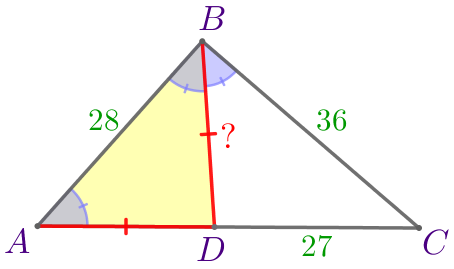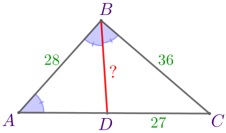Отрезок \(\displaystyle BD\) является биссектрисой треугольника \(\displaystyle ABC{\small,}\) углы \(\displaystyle ABD\) и \(\displaystyle CAB\) равны. Вычислите длину отрезка \(\displaystyle BD{\small,}\) если \(\displaystyle AB=28{\small,}\) \(\displaystyle BC=36{\small,}\) \(\displaystyle DC=27{\small.}\)