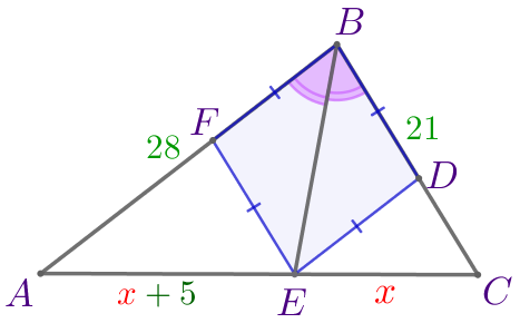 В треугольник \(\displaystyle ABC\) вписан ромб \(\displaystyle BDEF{\small.}\) Точки \(\displaystyle D{\small,}\) \(\displaystyle E\) и \(\displaystyle F\) лежат на сторонах \(\displaystyle BC{\small,}\) \(\displaystyle AC\) и \(\displaystyle AB\) треугольника \(\displaystyle ABC\) соответственно. Найдите периметр треугольника \(\displaystyle ABC{\small,}\) если известно, что \(\displaystyle AB=28{\small,}\) \(\displaystyle BC=21{\small,}\) \(\displaystyle AE-CE=5{\small.}\)