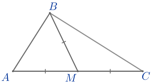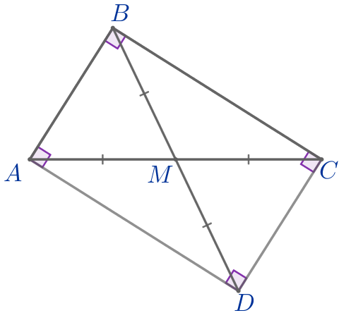 Выполним дополнительное построение. Продлим медиану \(\displaystyle BM\) за точку \(\displaystyle M\) и отметим точку \(\displaystyle D\) так, что \(\displaystyle BM=MD{\small.}\) Получили четырёхугольник \(\displaystyle ABCD{\small,}\) в котором \(\displaystyle AM=MC=BM=MD{\small.}\) То есть в четырёхугольнике \(\displaystyle ABCD\) диагонали равны и точкой пересечения делятся пополам. | ![]() |