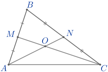 Точки \(\displaystyle M\) и \(\displaystyle N\) являются серединами сторон \(\displaystyle AB\) и \(\displaystyle BC\) треугольника \(\displaystyle ABC\) соответственно. Отрезки \(\displaystyle AN\) и \(\displaystyle CM\) пересекаются в точке \(\displaystyle O{\small,}\) \(\displaystyle AN=15{\small,}\) \(\displaystyle CM=21{\small.}\) Найдите \(\displaystyle AO{\small.}\)