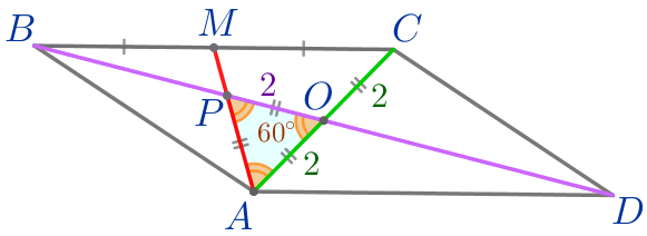 \(\displaystyle \color{blue}{3)}\) Все углы треугольника \(\displaystyle AOP\) равны \(\displaystyle 60^{\circ}{\small,}\) значит,