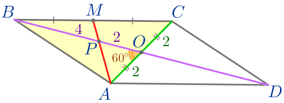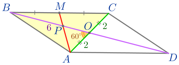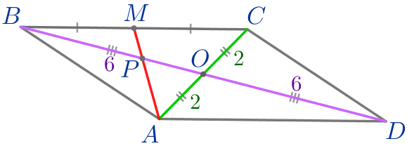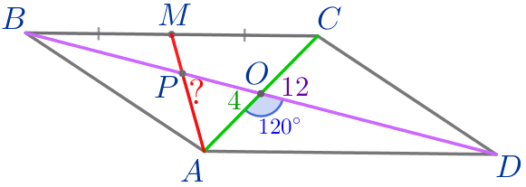 В параллелограмме \(\displaystyle ABCD\) диагонали пересекаются в точке \(\displaystyle O{\small,}\) точка \(\displaystyle M\) – середина стороны \(\displaystyle BC{\small.}\) Найдите \(\displaystyle AM{\small,}\) если \(\displaystyle BD=12{\small,}\) \(\displaystyle AC=4{\small,}\) а угол \(\displaystyle AOD\) равен \(\displaystyle 120^{\circ}{\small.}\)