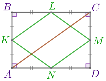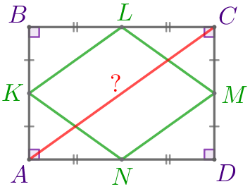 Точки \(\displaystyle K{\small,}\) \(\displaystyle L{\small,}\) \(\displaystyle M{\small,}\) \(\displaystyle N\) – середины сторон прямоугольника \(\displaystyle ABCD{\small.}\) Найдите длину диагонали \(\displaystyle AC\) прямоугольника \(\displaystyle ABCD{\small,}\) если периметр четырёхугольника \(\displaystyle KLMN\) равен \(\displaystyle 72{\small.}\)