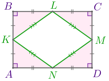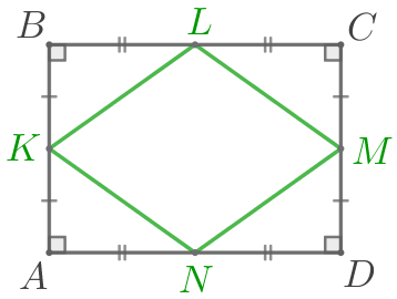 Точки \(\displaystyle K{\small,}\) \(\displaystyle L{\small,}\) \(\displaystyle M{\small,}\) \(\displaystyle N\) – середины сторон прямоугольника \(\displaystyle ABCD{\small.}\) Определите вид четырёхугольника \(\displaystyle KLMN{\small.}\)