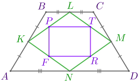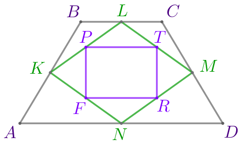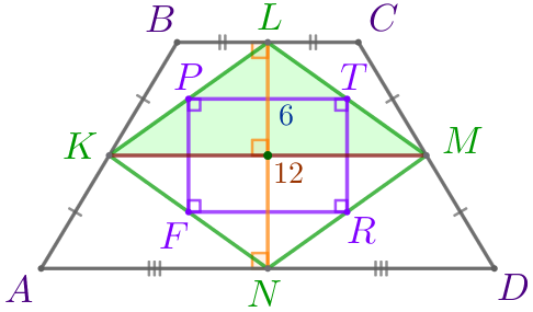 Точки \(\displaystyle K{\small,}\) \(\displaystyle L{\small,}\) \(\displaystyle M{\small,}\) \(\displaystyle N\) – середины сторон равнобедренной трапеции \(\displaystyle ABCD{\small.}\) Точки \(\displaystyle F{\small,}\) \(\displaystyle P{\small,}\) \(\displaystyle T{\small,}\) \(\displaystyle R\) – середины сторон четырёхугольника \(\displaystyle KLMN{\small.}\) Найдите периметр четырёхугольника \(\displaystyle FPTR{\small,}\) если высота трапеции \(\displaystyle ABCD\) равна \(\displaystyle 10\) и \(\displaystyle AD=16{\small,}\) \(\displaystyle BC=8{\small.}\)
