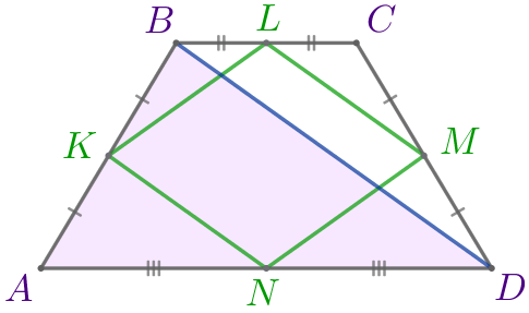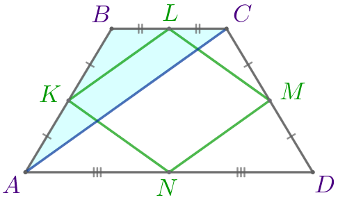 ![]() | \(\displaystyle KM\) – средняя линия трапеции \(\displaystyle ABCD{\small,}\) значит, \(\displaystyle KM \parallel AD{\small,}\) \(\displaystyle KM \parallel BC{\small,}\\ \) \(\displaystyle KM=\frac{AD+BC}{2}=\frac{16+8}{2}=12{\small.}\) |