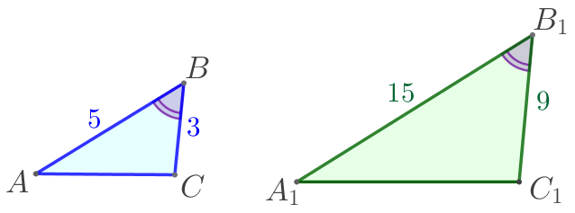 Стороны \(\displaystyle AB\) и \(\displaystyle BC\) треугольника \(\displaystyle ABC\) равны \(\displaystyle 5\) и \(\displaystyle 3\) соответственно. Стороны \(\displaystyle A_1B_1\) и \(\displaystyle B_1C_1\) треугольника \(\displaystyle A_1B_1C_1\) равны \(\displaystyle 15\) и \(\displaystyle 9\) соответственно. Известно, что \(\displaystyle \angle ABC= \angle A_1B_1C_1{\small.}\)