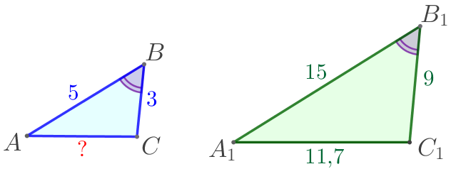 Стороны \(\displaystyle AB\) и \(\displaystyle BC\) треугольника \(\displaystyle ABC\) равны \(\displaystyle 5\) и \(\displaystyle 3\) соответственно. Стороны \(\displaystyle A_1B_1\) и \(\displaystyle B_1C_1\) треугольника \(\displaystyle A_1B_1C_1\) равны \(\displaystyle 15\) и \(\displaystyle 9\) соответственно. Известно, что \(\displaystyle \angle ABC= \angle A_1B_1C_1{\small.}\) Найдите длину стороны \(\displaystyle AC{\small,}\) если \(\displaystyle A_1C_1=11{,}7{\small.}\)