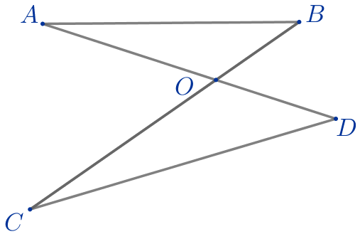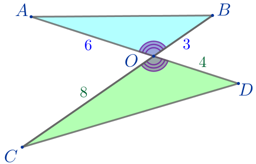 Отрезки \(\displaystyle AD\) и \(\displaystyle BC\) пересекаются в точке \(\displaystyle O{\small.}\) При этом \(\displaystyle OA=6{\small,}\) \(\displaystyle OB=3{\small,}\) \(\displaystyle OD=4{\small,}\) \(\displaystyle OC=8{\small.}\)