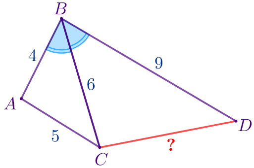 Даны два треугольника \(\displaystyle ABC\) и \(\displaystyle CBD\) такие, что \(\displaystyle AB=4{\small,}\) \(\displaystyle BC=6{\small,}\) \(\displaystyle BD=9\) и \(\displaystyle \angle ABC= \angle CBD{\small.}\) Найдите длину отрезка \(\displaystyle CD{\small,}\) если \(\displaystyle AC=5{\small.}\)