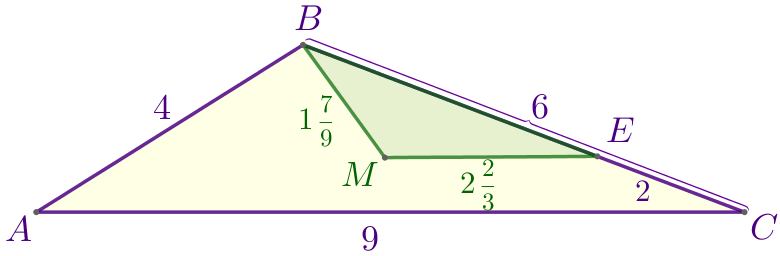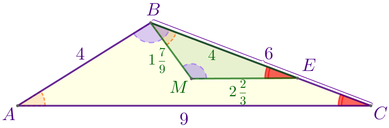 В треугольнике \(\displaystyle ABC\) \(\displaystyle AB=4{\small,}\) \(\displaystyle BC=6{\small,}\) \(\displaystyle AC=9{\small.}\) Точка \(\displaystyle E\) лежит на стороне \(\displaystyle BC{\small.}\) Внутри треугольника взята точка \(\displaystyle M\) так, что \(\displaystyle MB=1{\small \frac{7}{9}}{\small,}\) \(\displaystyle ME=2 {\small \frac{2}{3}}{\small,}\) \(\displaystyle CE=2{\small.}\) Укажите угол, равный углу \(\displaystyle BEM{\small.}\)