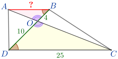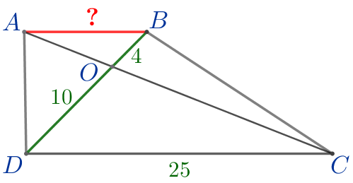 Диагонали трапеции \(\displaystyle ABCD\) с основаниями \(\displaystyle AB\) и \(\displaystyle CD\) пересекаются в точке \(\displaystyle O{\small.}\) Найдите \(\displaystyle AB{\small,}\) если \(\displaystyle OB=4{\small,}\) \(\displaystyle OD=10{\small,}\) \(\displaystyle CD=25{\small.}\)