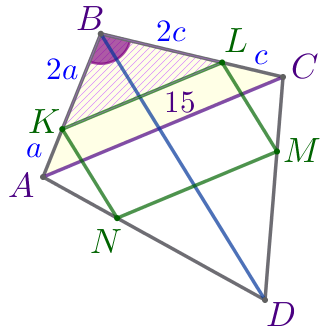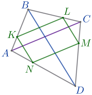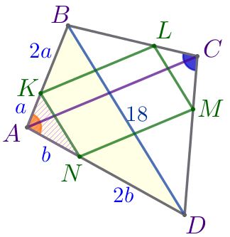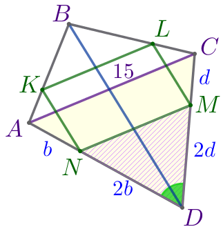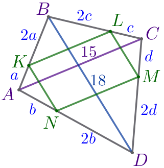 Найдите периметр четырёхугольника \(\displaystyle KLMN{\small,}\) если \(\displaystyle AC=15{\small,}\) \(\displaystyle BD=18{\small.}\)