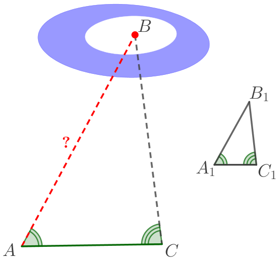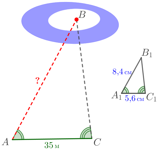 Для определения расстояния от точки \(\displaystyle A\) до недоступной точки \(\displaystyle B\) на местности выбрали точку \(\displaystyle C\) и измерили отрезок \(\displaystyle AC{\small,}\) углы \(\displaystyle BAC\) и \(\displaystyle ACB{\small.}\) Затем построили на бумаге треугольник \(\displaystyle A_1B_1C_1{\small,}\) подобный треугольнику \(\displaystyle ABC{\small.}\) Найдите \(\displaystyle AB{\small,}\) если \(\displaystyle AC=35\, {\footnotesize м}{\small,}\) \(\displaystyle A_1C_1=5{,}6\, {\footnotesize см}{\small,}\) \(\displaystyle A_1B_1=8{,}4\, {\footnotesize см}{\small.}\)