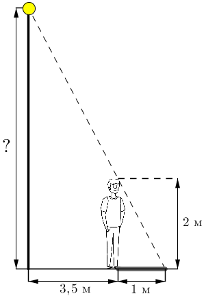 Человек, рост которого \(\displaystyle 2\)м, стоит на расстоянии \(\displaystyle 3{,}5\)м от уличного фонаря. При этом длина тени человека равна \(\displaystyle 1\)м. Определите высоту фонаря (в метрах).