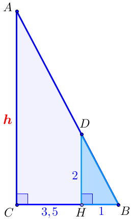 - \(\displaystyle CH=3{,}5 \small, \) \(\displaystyle BH=1 \small, \) \(\displaystyle DH=2 \small, \) \(\displaystyle AC=\red{h} \small. \)
