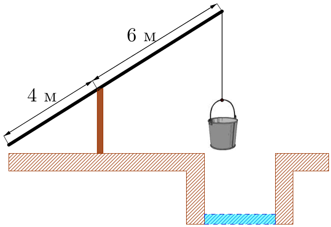 На рисунке изображен колодец с "журавлём". Короткое плечо имеет длину \(\displaystyle 4\)м, а длинное плечо – \(\displaystyle 6\)м. На сколько метров опустится конец длинного плеча, когда конец короткого поднимется на \(\displaystyle 1\)м?