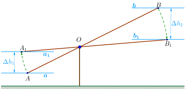 \(\displaystyle \Delta h_1\) и \(\displaystyle \Delta h_2\) – изменение высот концов соответствующих плеч рычага.