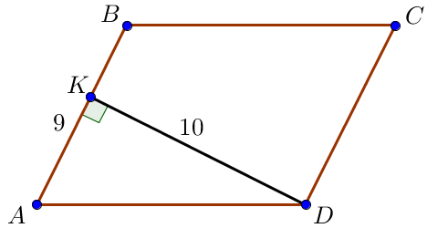 Пусть стороны параллелограмма \(\displaystyle AB=9\) и \(\displaystyle AD=15\small,\) высота \(\displaystyle DK=10 {\small .}\)