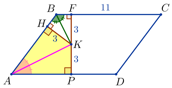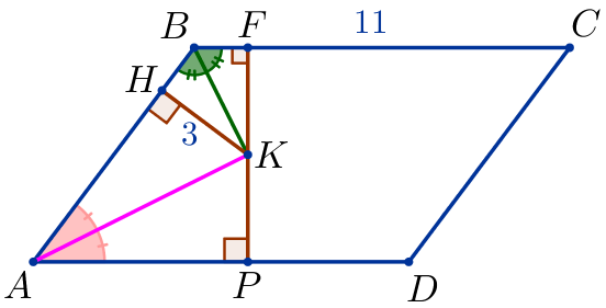 Биссектрисы углов \(\displaystyle A\) и \(\displaystyle B\) параллелограмма \(\displaystyle ABCD\) пересекаются в точке \(\displaystyle K{\small.}\) Найдите площадь параллелограмма, если \(\displaystyle BC=11 {\small,}\) а расстояние от точки \(\displaystyle K\) до стороны \(\displaystyle AB\) равно \(\displaystyle 3 {\small.}\)