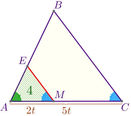 Найдём коэффициент подобия \(\displaystyle p\) треугольников \(\displaystyle AEM\) и \(\displaystyle ABC{\small:}\) \(\displaystyle p=\frac{AM}{AC}=\frac{2t}{5t}=\frac{2}{5}{\small.}\) |