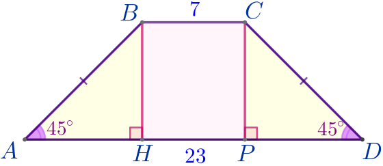 Найдите площадь равнобедренной трапеции, если её основания равны \(\displaystyle 7\) и \(\displaystyle 23{\small,}\) а один из углов равен \(\displaystyle 45^{\circ}{\small.}\)
