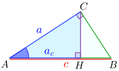 В прямоугольном треугольнике \(\displaystyle ABC\) с прямым углом \(\displaystyle C\) и высотой \(\displaystyle CH\) отмечены отрезки \(\displaystyle AC=a{\small,}\) \(\displaystyle AB=c{\small,}\) \(\displaystyle AH=a_{c}{\small.}\)