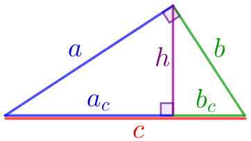 ![]() | \(\displaystyle \Large \color{blue}{a}=\sqrt{\color{red}{c}\cdot \color{blue}{a_{c}}}\\ \) \(\displaystyle \Large \color{green}{b}=\sqrt{\color{red}{c}\cdot \color{green}{b_{c}}}\) |