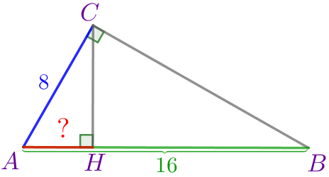 В прямоугольном треугольнике \(\displaystyle ABC\) с прямым углом \(\displaystyle C\) и высотой \(\displaystyle CH{\small:}\) \(\displaystyle AC=8{\small,}\) \(\displaystyle AB=16{\small.}\) Найдите длину отрезка \(\displaystyle AH{\small.}\)