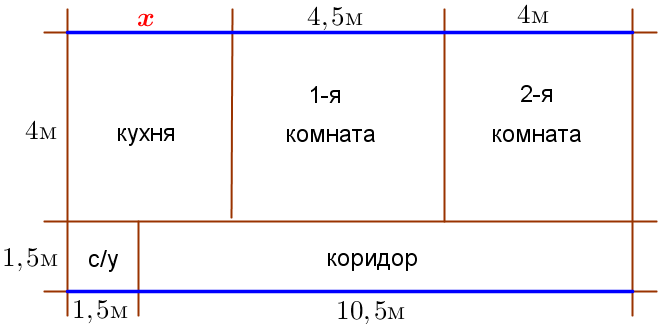 Найдем значение \(\displaystyle \color{red}{x}\small. \) Квартира имеет форму прямоугольника. В прямоугольнике противоположные стороны равны. Значит, сумма длин кухни и двух комнат равна сумме длин санузла и коридора (см. чертеж). То есть \(\displaystyle \color{red}x+4{,}5+4=1{,}5+10{,}5 \small,\) \(\displaystyle \color{red}x=12-8{,}5=3{,}5\small.\) | ![]() |