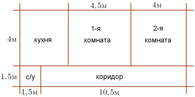 Квартира состоит из двух комнат, кухни, коридора и санузла (см. чертеж). Первая комната имеет размеры \(\displaystyle 4{\scriptsize{ м}} ×4{,}5{\scriptsize{ м}} {\small,} \) вторая – \(\displaystyle 4{\scriptsize{ м}} × 4{\scriptsize{ м}} {\small, }\) санузел – \(\displaystyle 1{,}5{\scriptsize{ м}} × 1{,}5{\scriptsize{ м}} \small, \) длина коридора\(\displaystyle 10{,}5{\scriptsize{ м}} \small. \\ \) Найдите площадь кухни(в квадратных метрах).