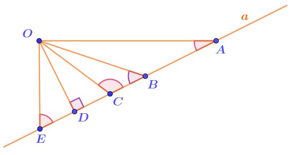 На рисунке изображены несколько отрезков, соединяющих точку \(\displaystyle O\) с точками \(\displaystyle E{\small ,}\) \(\displaystyle D{\small ,}\) \(\displaystyle C{\small ,}\) \(\displaystyle B\) и \(\displaystyle A\) на прямой \(\displaystyle a{\small .}\)
