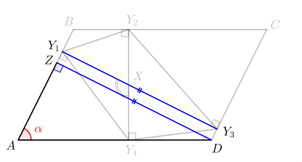 Отрезок \(\displaystyle Y_1Y_3\) является одной из высот параллелограмма. Проведем отрезок \(\displaystyle DZ\) – параллельный \(\displaystyle Y_1Y_3\small.\) Противоположные стороны \(\displaystyle DZY_1Y_3\) параллельны, то есть \(\displaystyle DZY_1Y_3\) – параллелограмм и \(\displaystyle DZ=Y_1Y_3\small.\) Рассмотрим прямоугольный треугольник \(\displaystyle DAZ\small.\) В нем \(\displaystyle DZ=AD\sin\alpha\small.\) Значит, \(\displaystyle Y_1Y_3=DZ=AD\sin\alpha\small.\) | ![]() |