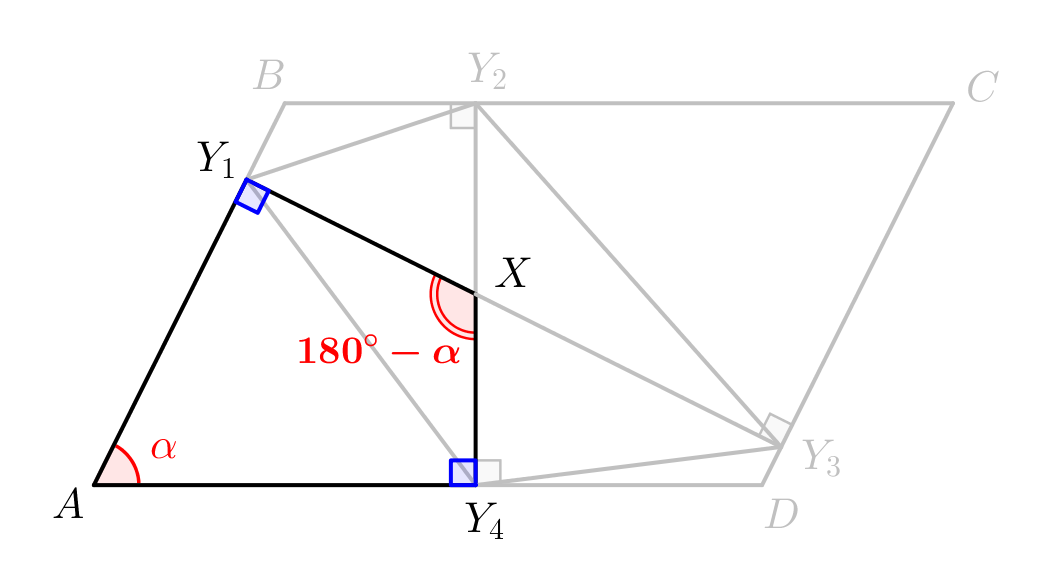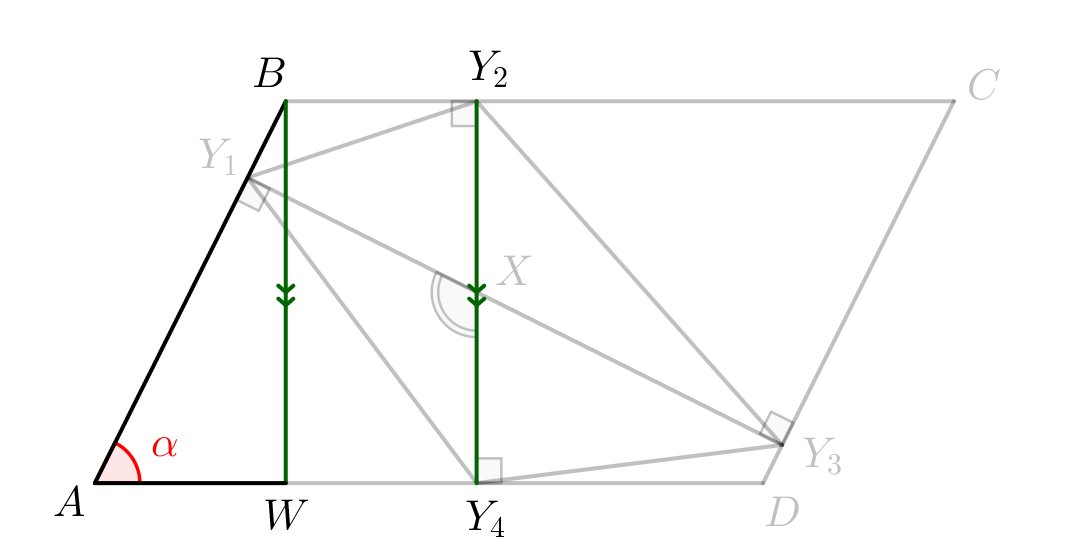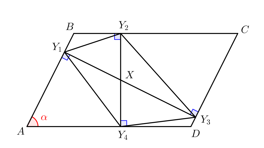 Один из углов параллелограмма равен \(\displaystyle \alpha\small.\) Внутри параллелограмма отметили точку \(\displaystyle X\) и получили четыре проекции точки \(\displaystyle X\) на все стороны параллелограмма: \(\displaystyle Y_1,\,Y_2,\,Y_3\) и \(\displaystyle Y_4\small.\) Найдите отношение площади исходного параллелограмма к площади \(\displaystyle Y_1Y_2Y_3Y_4{\small:}\)