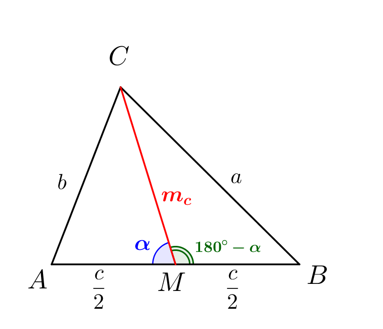 \(\displaystyle \color{green}{a^2=m_c^2+\left(\frac{c}{2}\right)^2-2m_c\left(\frac{c}{2}\right)\cos(180^{\circ}-\alpha)}\small.\)